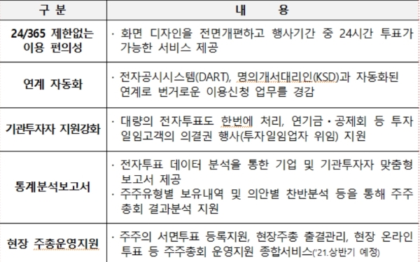 기관전용전자투표 서비스가 제공됨에 따라 다수의 주주총회에 일괄로 의결권행사가 가능하다. 연기금공제회 등 투자일임한 고객의 의결권 대리행사도 지원한다.