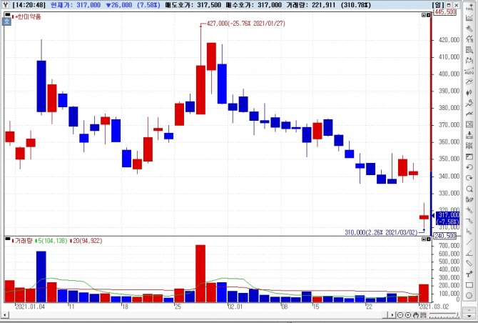 이미지 확대보기2일 주식시장에서 한미약품은 경구용 항암신약 ‘오락솔’의 미국 식품의약국(FDA) 허가가 불발됐다는 소식에 오후 2시 37분 현재 7.29% 하락한 31만8000원에 거래되고 있다.