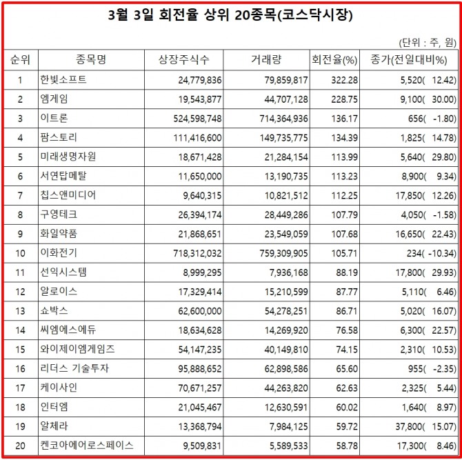 3일 주식시장에서 코스닥 종목의 거래량 회전율 기준 상위 종목은 다음과 같다.
