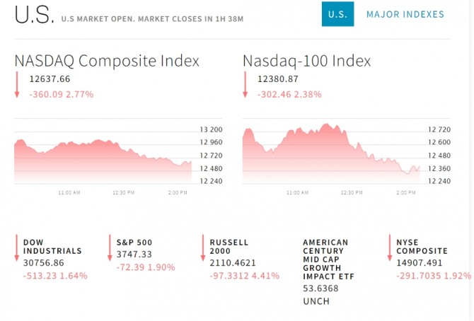 이날 뉴욕증시는 제롬 파월 연방준비제도(Fed) 의장의 발언 실망으로 급락세다. 뉴욕증권거래소(NYSE)에서 다우존스 30 산업평균지수와 스탠더드앤드푸어스(S&P) 500 지수 그리고 기술주의 나스닥 지수 모두 하락이다. 미국 국채 금리가 큰 폭으로 오르면서 뉴욕증시의 불안감도 고조된 상황이다. 기술주가 큰 타격을 받고있다.