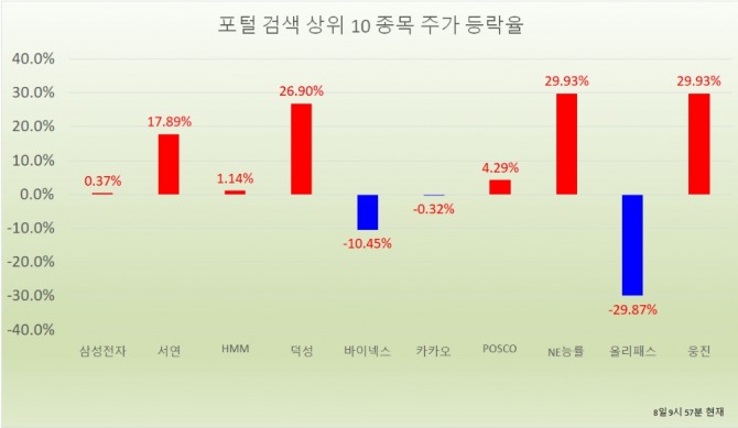 오전 9시 57분 현재 포털사가 집계하는 검색량 기준 상위 20개 종목의 현황은 다음과 같다.