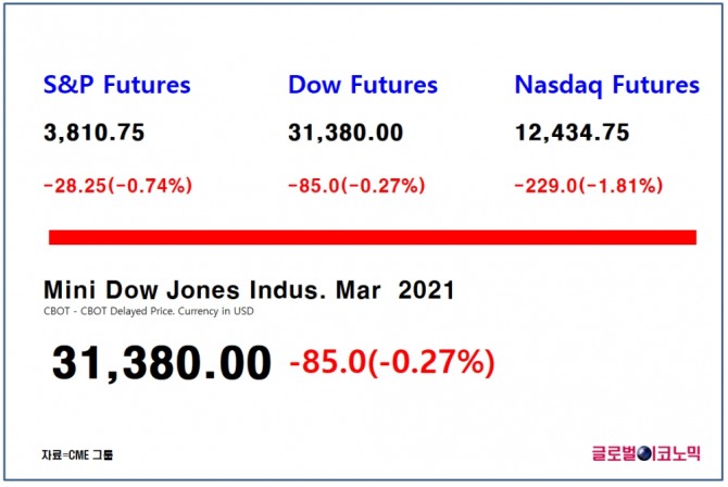 스탠더드 앤드 푸어스(S&P) 500 지수 선물은 0.74%(28.25포인트) 하락한 3810.75에 거래되고 있고, 나스닥 100 선물은 1.81%(229포인트)하락한 1만2434.75에 거래되고 있다.