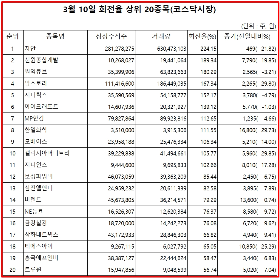 10일 주식시장에서 코스닥 종목의 거래량 회전율 기준 상위 종목은 다음과 같다.