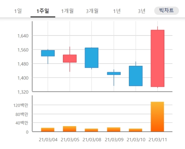 4거래일만에 상승으로 가격제한폭까지 오른 상한가를 기록중이다.