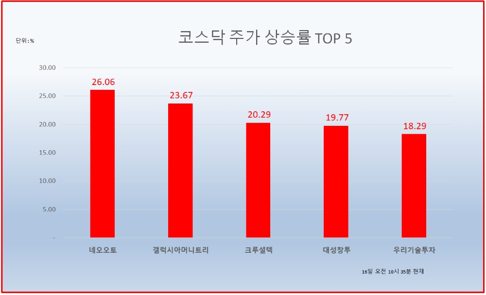 이미지 확대보기16일 오전 10시 35분 현재 코스닥 상승률 상위 50개 종목은 다음과 같다.