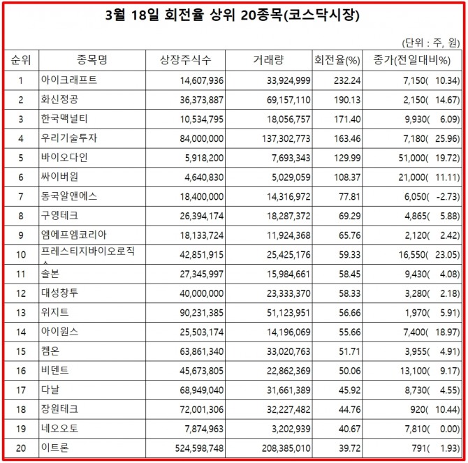 18일 주식시장에서 코스닥 종목의 거래량 회전율 기준 상위 종목은 다음과 같다.