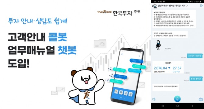 한국투자증권도 AI 기술을 바탕으로 챗봇의 영역을 고객안내 콜봇과 직원용 업무 매뉴얼 챗봇으로 확대했다. 콜봇은 안내사항이 필요한 고객에게 AI가 직원 대신 전화로 금융상품과 대출의 만기 안내, 금융상품 판매 적정성을 확인하는 해피콜 등을 수행한다. 앞으로 영업 외 시간의 금융사고 접수와 같은 24시간 AI로 처리할 수 있는 업무에 콜봇 서비스를 도입할 계획이다. 한국투자증권은 챗봇을 업무효율성 강화수단으로 활용하고 있다. 업무매뉴얼을 직원이 채팅 형태로 챗봇에 문의하면 AI가 관련정보를 찾아 답변하는 방식이다. 챗봇을 통해 영업점 직원이 빠르고 정확하게 고객대응을 할 것으로 기대하고 있다.