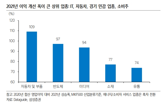 실제 시장에서 전망하는 올해 이익 개선 폭이 큰 상위 업종 역시 IT, 자동차, 정유, 화학, 철강 등 경기 민감주, 유통, 면세 등 소비주들이 다수 포진되어 있다.