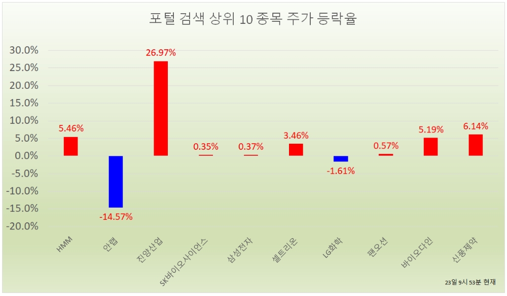 이미지 확대보기오전 9시 53분 현재 포털사가 집계하는 검색량 기준 상위 20개 종목의 현황은 다음과 같다.