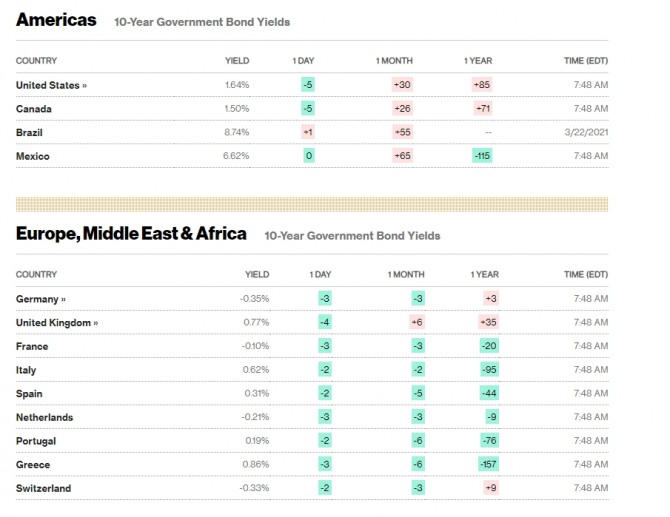 이 시각 현 재 미국의 국채 금리는 10년물 기준 1.64%로 떨어져 있다. <도표 참조>