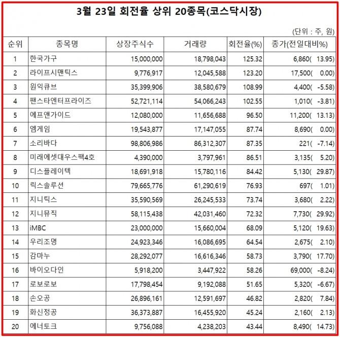 23일 주식시장에서 코스닥 종목의 거래량 회전율 기준 상위 종목은 다음과 같다.