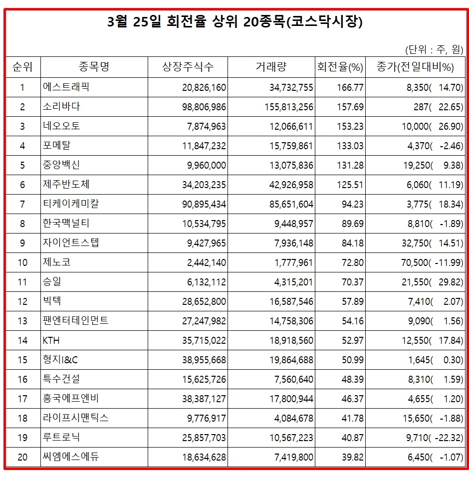 25일 주식시장에서 코스닥 종목의 거래량 회전율 기준 상위 종목은 다음과 같다.