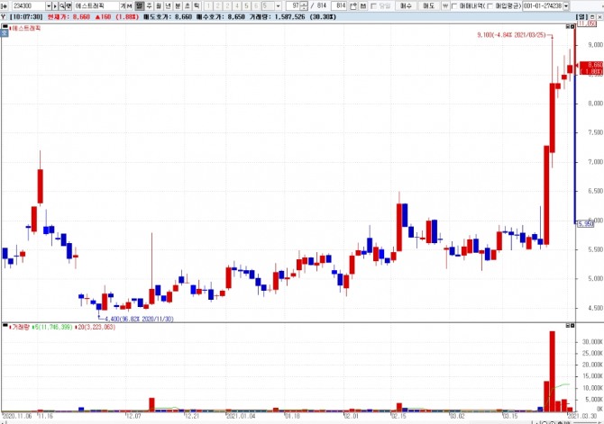 이미지 확대보기30일 주식시장에서 에스트래픽은 오전 9시 56분 현재 전날보다 2.71%(230원) 상승한 8730원에 거래되고 있다.