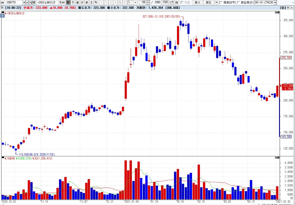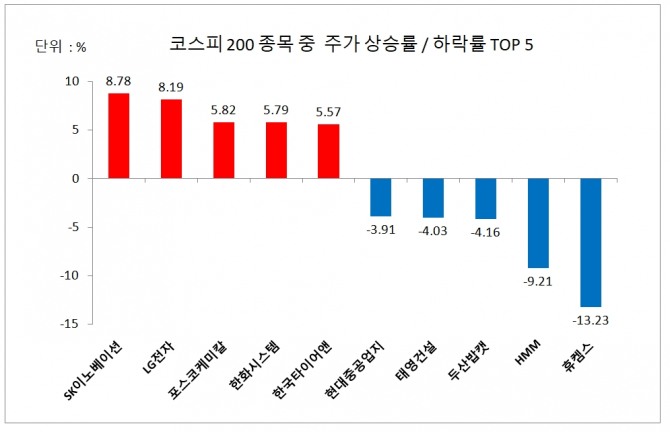 이미지 확대보기30일 한국거래소에 따르면, SK이노베이션은 전날보다 8.78%(1만8000원) 상승한 22만3000원에 거래를 마감해 코스피 200 구성 종목 중 주가 상승률 1위를 기록했다.