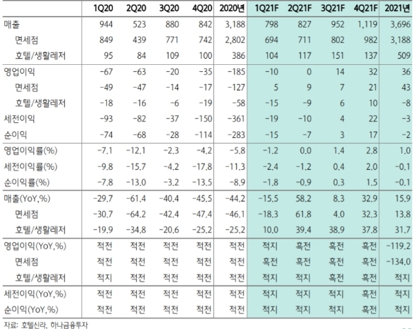 호텔신라 실적추정치, 단위:십억 원, 자료=하나금융투자이미지 확대보기