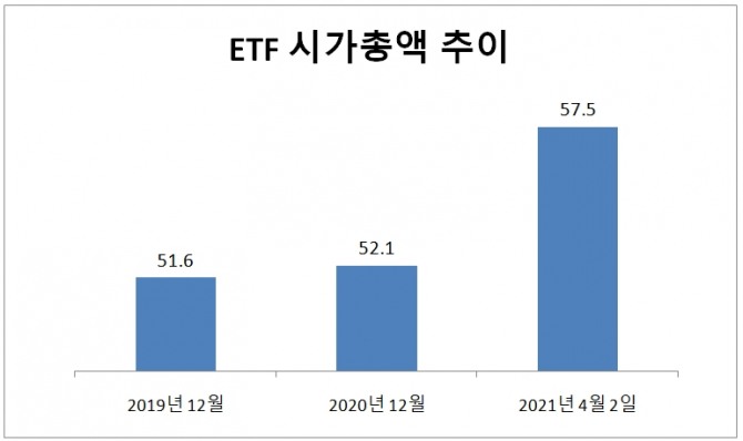 4일 한국거래소에 따르면, 지난 2일 기준 상장 ETF 시가총액은 57조4841억 원으로 지난해 말 보다 5조 원 이상 증가한 것으로 나타났다.