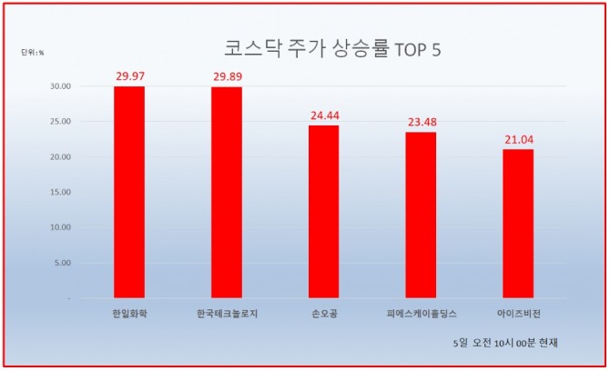 1위 한일화학 22550원 ( 29.97% ), 2위 한국테크놀로지 1760원 ( 29.89% ), 3위 손오공 3360원 ( 24.44% ), 4위 피에스케이홀딩스 11200원 ( 23.48% ), 5위 아이즈비전 5840원 ( 21.04% ), 6위 디지캡 8550원 ( 19.58% ), 7위 셀바스헬스케어 3105원 ( 18.51% ), 8위 현우산업 4995원 ( 13.01% ), 9위 로보스타 29100원 ( 13.23% ), 10위 보성파워텍 2920원 ( 12.09% )
