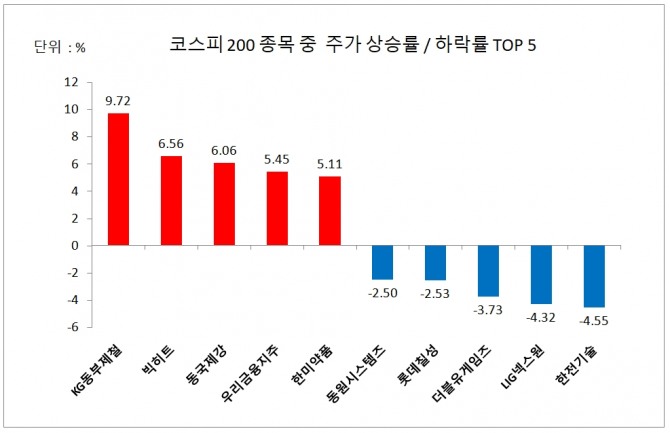 우량주로 구성된 코스피 200 구성종목 중 주가상승률과 주가하락률 상위 30종목은 다음과 같다.