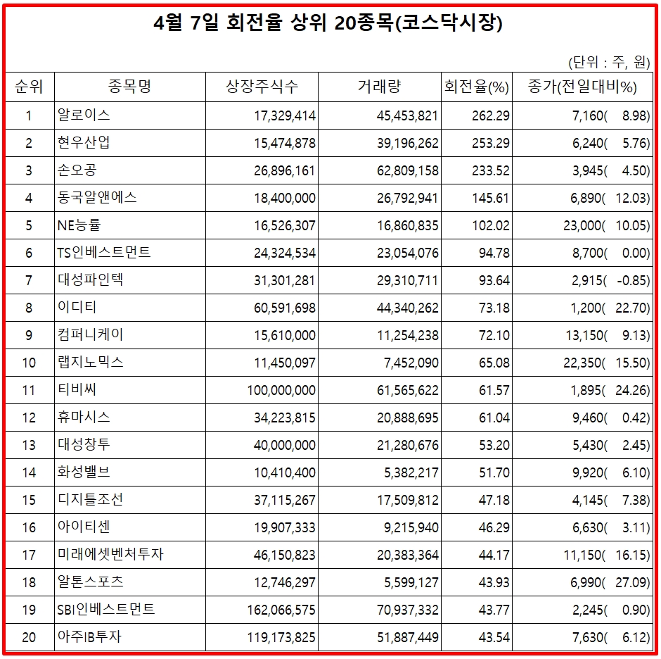 7일 주식시장에서 코스닥 종목의 거래량 회전율 기준 상위 종목은 다음과 같다.