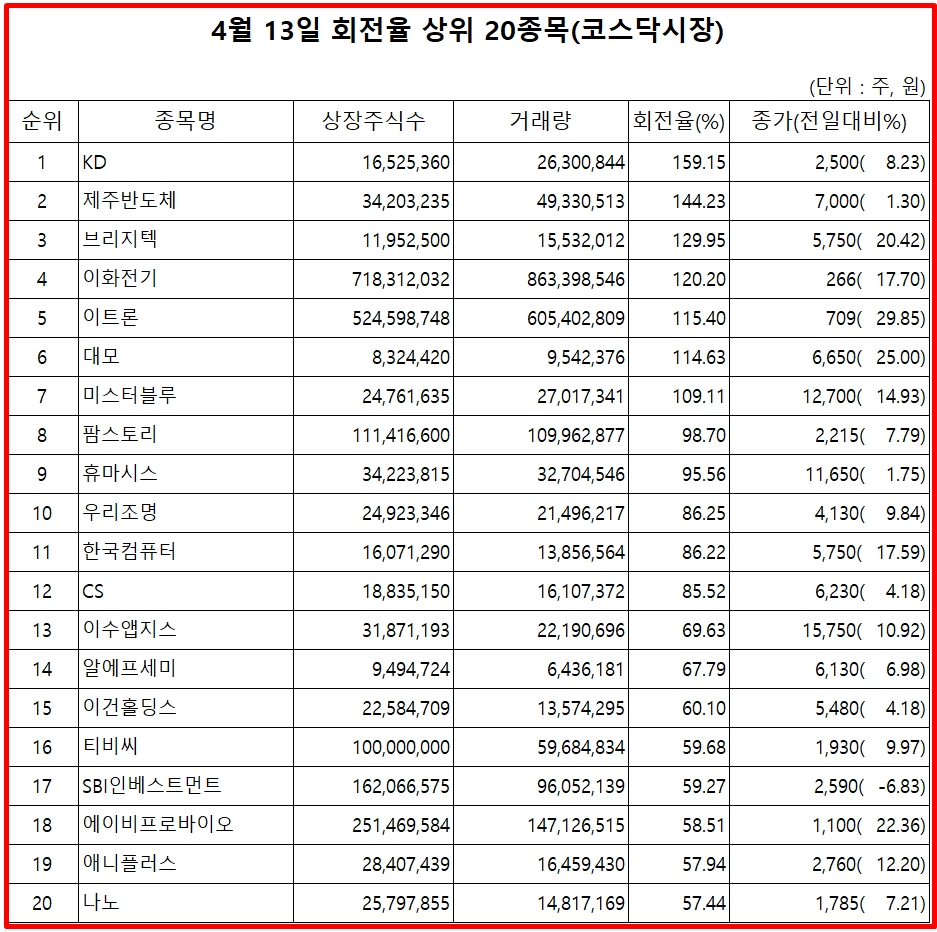 13일 주식시장에서 코스닥 종목의 거래량 회전율 기준 상위 종목은 다음과 같다.