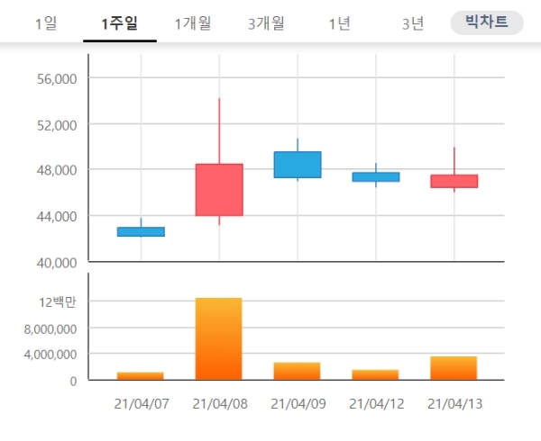 현대바이오 주가는 종가기준으로 5일 4만5100원에서 13일 4만7500원으로 약 5% 올랐다.