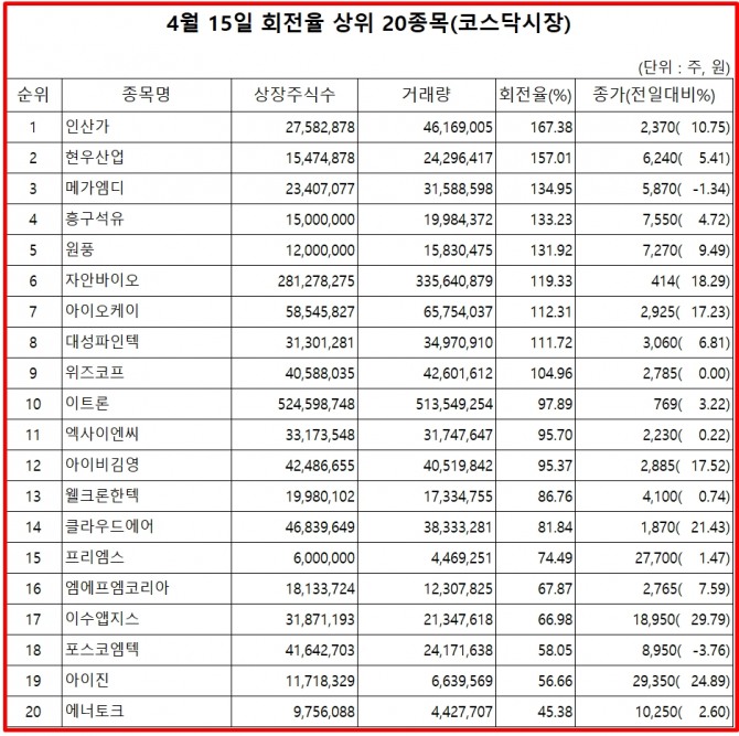 15일 주식시장에서 코스닥 종목의 거래량 회전율 기준 상위 종목은 다음과 같다.