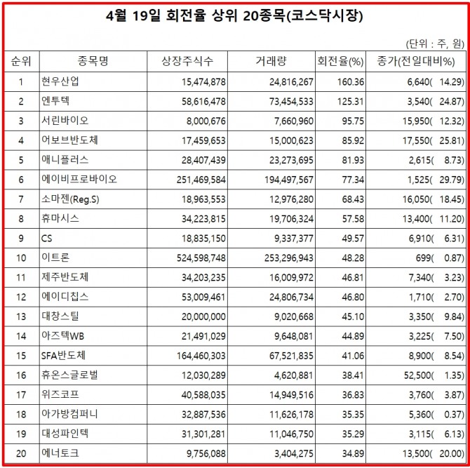 19일 주식시장에서 코스닥 종목의 거래량 회전율 기준 상위 종목은 다음과 같다.