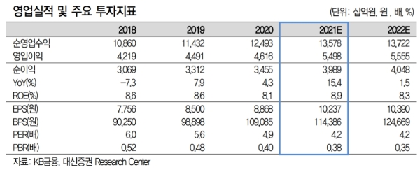 박혜진 대신증권 연구원은 "이번 분기 순이익을 경상체력으로 간주해도 무방하다”며 “2021년 대손비용율 0.24%(2020년 0.26%)로 보수적으로 가정해도 연간이익이 4조 원에 육박하는데, 021년 예상 자기자본이익률(ROE)은 8.95%로 2017년을 제외하고 가장 높은 수준”이라고 내다봤다.