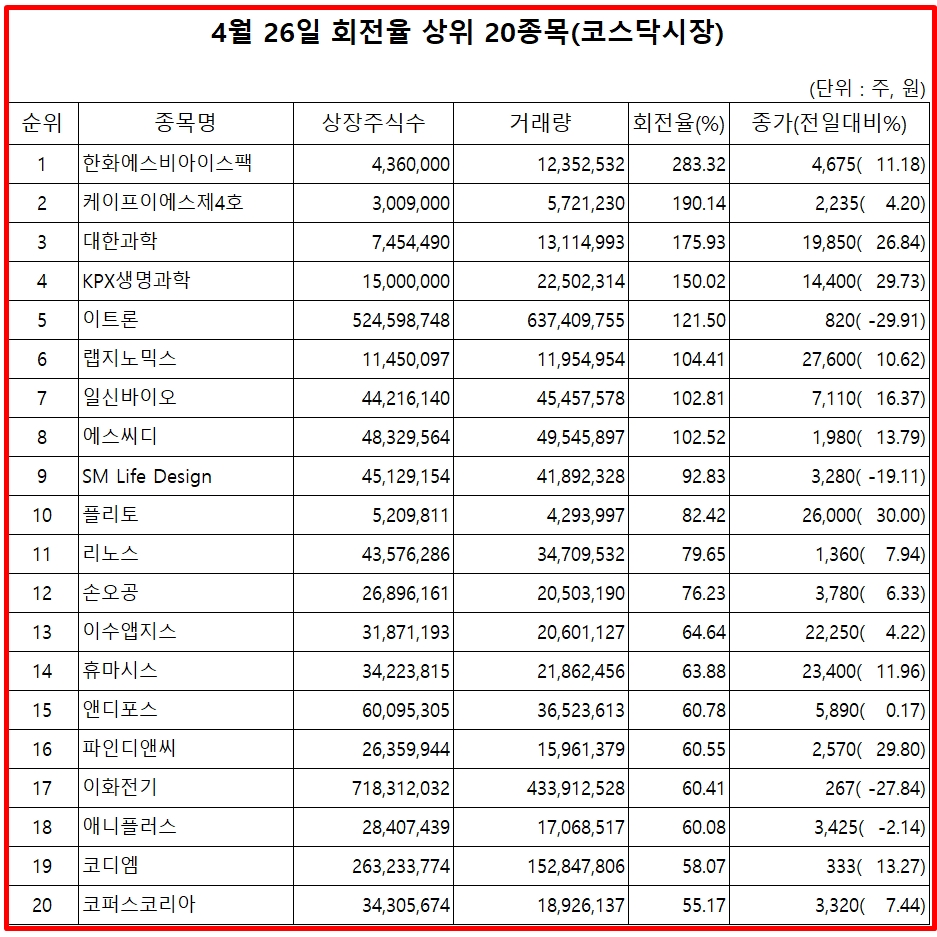 26일 주식시장에서 코스닥 종목의 거래량 회전율 기준 상위 종목은 다음과 같다.