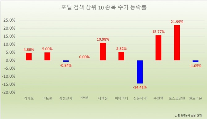 오전 9시 30분 현재 포털사가 집계하는 검색량 기준 상위 20개 종목의 현황은 다음과 같다.