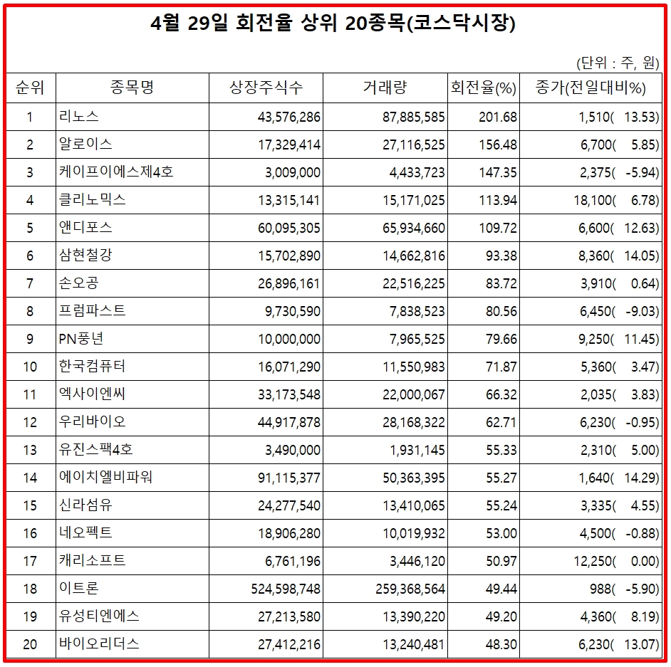 표기순서는 거래량 회전율 순위, 종목명, 거래량 회전율, 29일 종가, 주가 등락율 순이다.