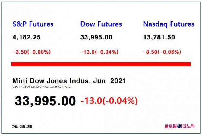 스탠더드 앤드 푸어스(S&P) 500 지수 선물은 0.08%(3.5포인트) 하락한 4182.25에 거래되고 있고, 나스닥 100 선물은 0.06%(8.5포인트)하락한 1만3781.5에 거래되고 있다.