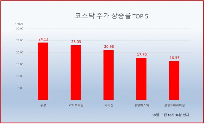 풍강 뒤를 이어 KT서브마린, 아이진 등도 20% 넘는 상승률을 기록하고 있다.