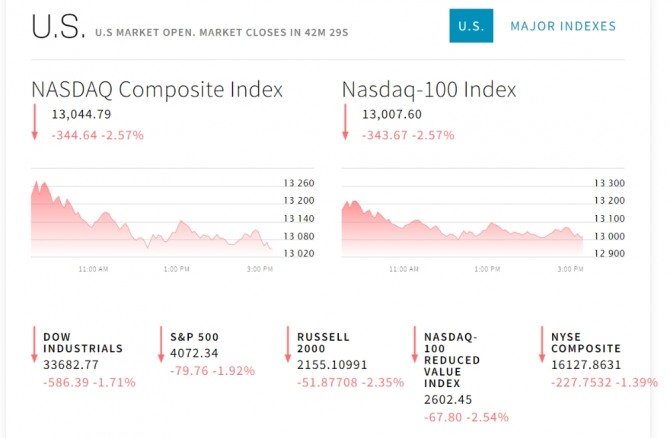 이미지 확대보기13일 뉴욕증시에 따르면 미국의 4월 소비자물가가 큰 폭으로 올랐다. 이 소식에 뉴욕증권거래소에서 다우존스30산업평균지수와 스탠더드앤드푸어스(S&P)500지수 그리고 기술주의 나스닥지수 일제히 그 급락세다.