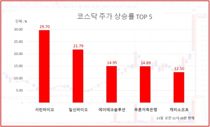 13일 오전 11시 10분 현재 코스닥 상승률 상위 50개 종목은 다음과 같다.