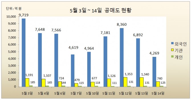 외국인 투자자들은 공매도 재개 시점인 지난 3일 부터 14일 까지 총 6조1218억의 공매도 거래대금을 기록했다.