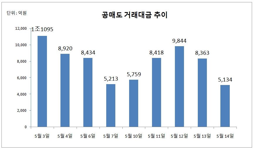 지난 3일 공매도 재개 이후 14일까지 누적 거래대금은 유가증권시장 5조7217억 원, 코스닥 시장은 1조3963억 원, 합계 7조1180억 원을 기록했다.