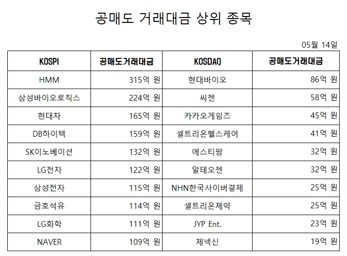 14일 유가증권시장에서 공매도 거래 대금 상위 종목은 다음과 같다.
