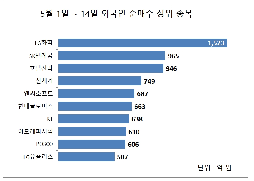 16일 한국거래소에 따르면, 5월 1일~14일 외국인 투자자들은 유가증권시장에서 LG화학을 1523억 원 순매수해 순매수 1위를 기록했다.