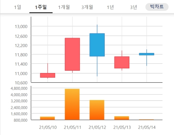 이날 주가가 급등하며 상승추세로 전환할지 주목된다.