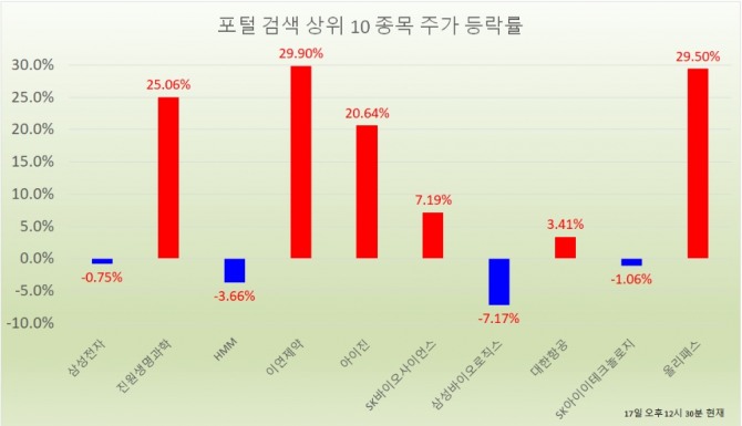 오후 12시 30분 현재 포털사가 집계하는 검색량 기준 상위 20개 종목의 현황은 다음과 같다.