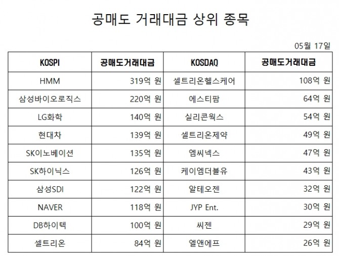 이미지 확대보기17일 유가증권시장에서 공매도 거래 대금 상위 종목은 다음과 같다.