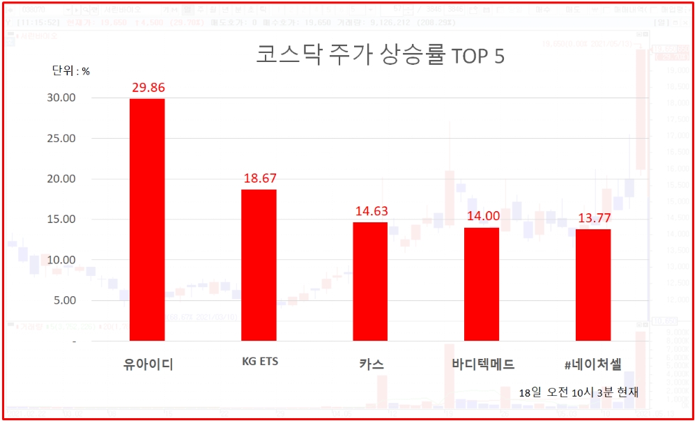 1위 유아이디 2740원 ( 29.86% ), 2위 KG ETS 8200원 ( 18.67% ), 3위 카스 4505원 ( 14.63% ), 4위 바디텍메드 22800원 ( 14% ), 5위#네이처셀 17350원 ( 13.77% ), 6위 KPX생명과학 12200원 ( 14.02% ), 7위 에이프로젠 H&G 1090원 ( 12.37% ), 8위 백금T&A 3995원 ( 12.38% ), 9위 서울리거 1735원 ( 12.3% ), 10위 로지시스 9600원 ( 9.97% )