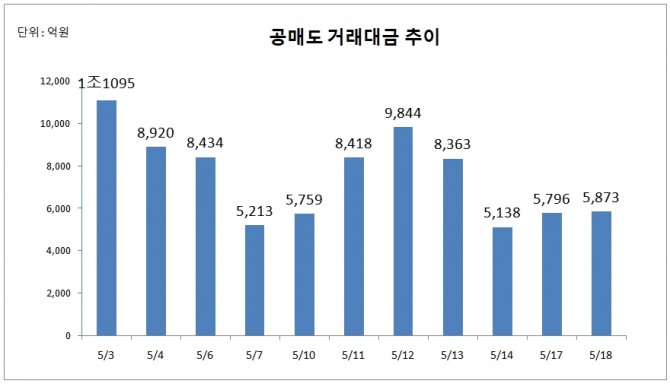 18일 공매도 거래대금은 5874억 원으로 전날 보다 77억 원 증가
