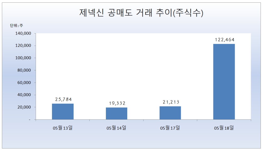 18일 제넥신의 공매도 규모는 12만2464주로, 공매도 거래대금은 134억 원 으로 집계됐다.