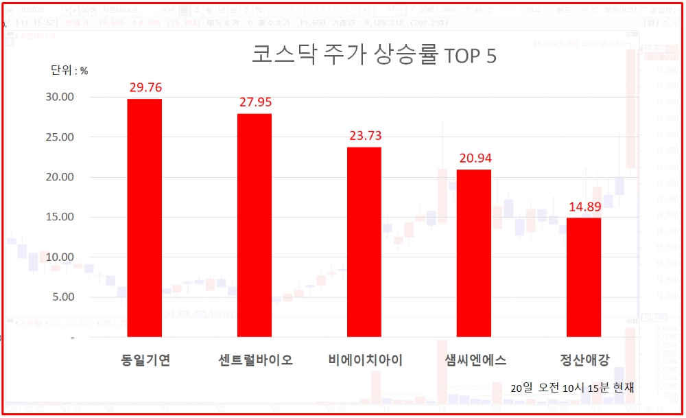 1위 동일기연 18750원 ( 29.76% ), 2위 센트럴바이오 2060원 ( 27.95% ), 3위 비에이치아이 4980원 ( 23.73% ), 4위 샘씨엔에스 7740원 ( 20.94% ), 5위 정산애강 2700원 ( 14.89% ), 6위 엘컴텍 1710원 ( 14% ), 7위 에이비프로바이오 1560원 ( 15.56% ), 8위 대동기어 6130원 ( 10.05% ), 9위 디자인 10900원 ( 9.44% ), 10위 이루온 2380원 ( 9.43% )