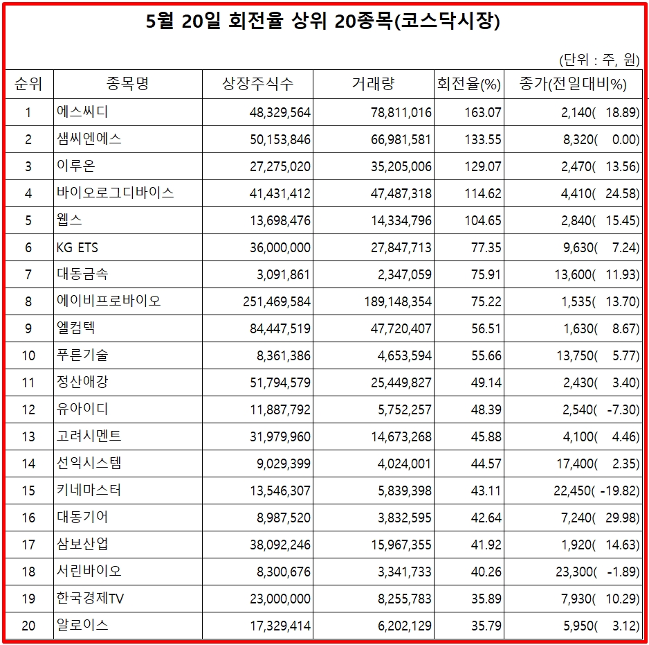 표기순서는 거래량 회전율 순위, 종목명, 거래량 회전율, 20일 종가, 주가 등락율 순이다.
