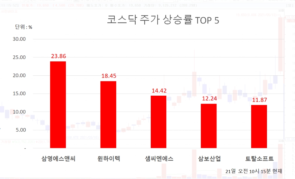 코스닥 종목 중 윈하이텍, 샘씨엔에스, 삼보산업 등의 주가 상승률이 돋보인다.