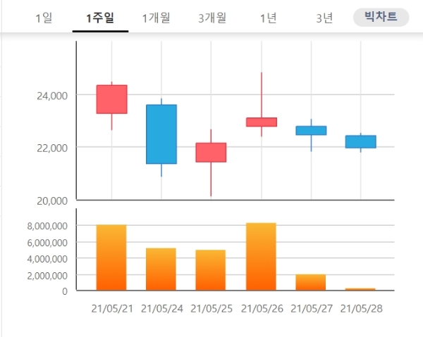 진원생명과학 주가는 종가기준으로 20일 2만3200원에서 27일 2만2450원으로 3% 내렸다.