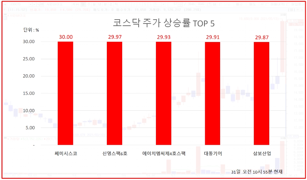 31일 10시 55분 현재 코스닥 상승률 상위 50개 종목은 다음과 같다.